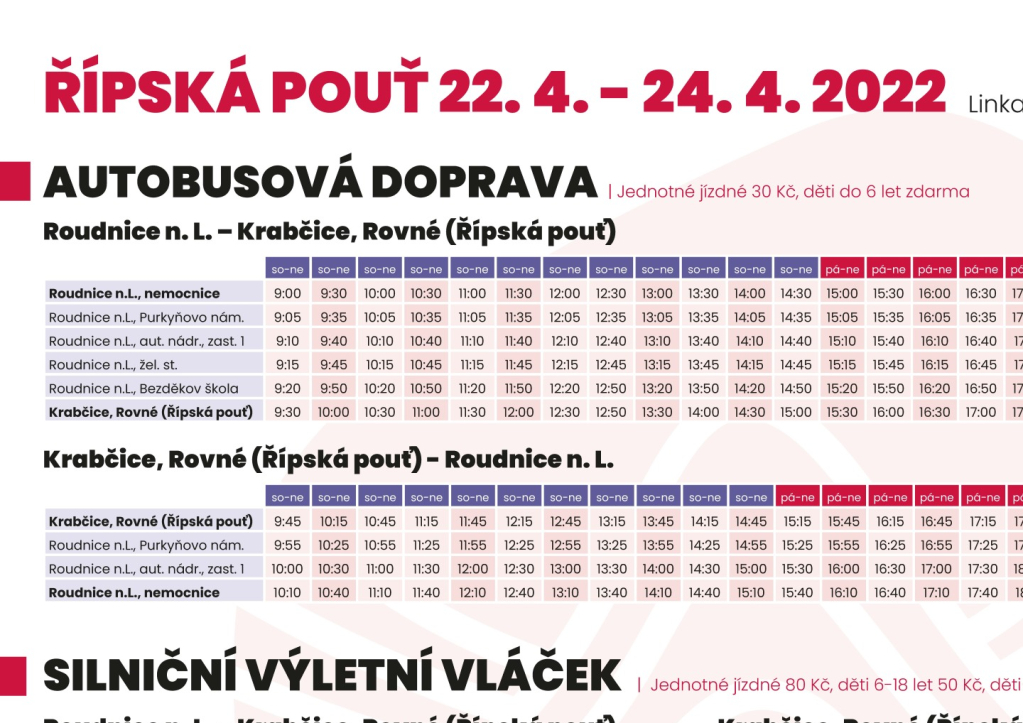 Vzhledem ke každoročnímu zájmu o pouť prosím počítejte, že může dojít ke zpoždění. Dispečink dopravy 474 774 666.
