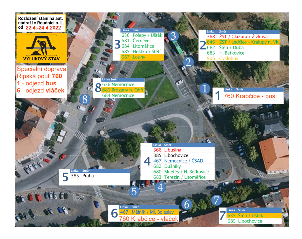 Silniční vláček bude jezdit přímou trasu z autobusového náměstí ze zastávky č. 6. Jedinou mezi zastávkou bude Purkyňovo náměstí – kde můžete nastupovat na straně ve směru od autobusového nádraží (u volného prostranství). Vláček ukončí jízdu ve stejné zastávce jako autobus - Krabčice, Rovné, váhy.